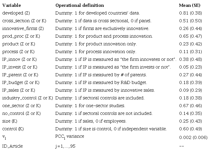 Figure 1 depicts the PRISMA flow diagram illustrating the identification phase of the study. From approximately 1,600 pieces of evidence, selection process ended up with 95 articles reporting a total of 655 econometric estimations4. The sample covers diverse countries, regions, sectors and econometric strategies. These features constitute the moderator variables utilized to carry out the multivariate MRA. Typically, moderators refer to geographical origin of data, (type and number of) variables included in the analysis and econometric specifications (STANLEY; DOUCOULIAGOS, 2012). Table 1 displays the variables explaining heterogeneity in current MRA. Moderator variables were selected based on their theoretical relevance to the firm size–innovation relationship, as they capture key contextual and methodological factors that could influence empirical findings. Table 1 displays the variables explaining heterogeneity in current MRA. The analysis period from 1993 to 2017 was selected to encompass over two decades of empirical research, capturing significant developments in innovation theory and econometric methodologies.