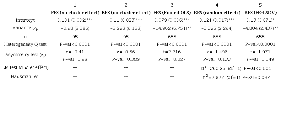 The model displayed in [6] is analogous to those frequently used in unbalanced panel data structures analysis, where each paper is considered as an individual with several observations, in addition to an unobservable component ui (STANLEY; DOUCOULIAGOS, 2017). If ui and the explanatory variables are correlated, random effects coefficients will be biased and inconsistent. In this case, the unobservables are extracted from the error term through usual fixed effects panel estimation. Another option is to add an identification dummy for each cluster or paper (this approach is called least squares dummy variable - LSDV) in order to capture the unobservable effect. To decide whether fixed or random effects estimators are accurate, a traditional Hausman test (WOOLDRIDGE, 2002) can be applied to MRA results.
