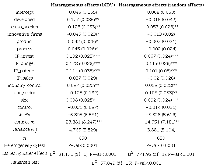 Table 3 shows the multivariate MRA results for LSDV and WLS models. In these models, the intercept is not the average effect but represents the value of PCC when all explanatory variables are set to zero. Consistent with our theoretical framework, the sources of heterogeneity include methodological dimensions (such as data structure, variable operationalization, and industry controls) and firm characteristics (like country development status, technological trajectory, and type of innovation). This aligns with previous findings (CAMISÓN et al., 2002; DAMANPOUR, 2010), suggesting that these factors play a significant role in moderating the firm size–innovation relationship.