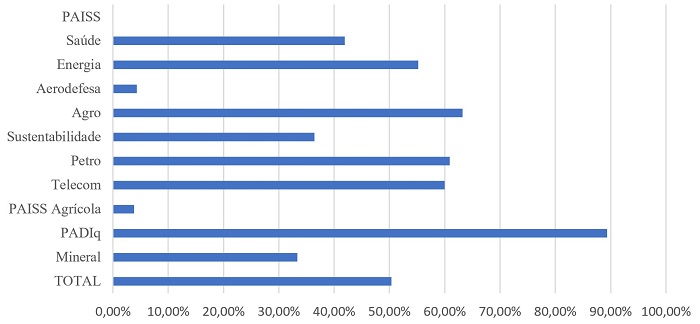 No Gráfico 2, os editais estão distribuídos em ordem cronológica de seu lançamento, o que confirma o argumento de “inovação média”. PADIq e Inova Mineral foram os editais lançados em 2016, que obtiveram as maiores taxas de desistência de participação na fase posterior à manifestação de interesse.