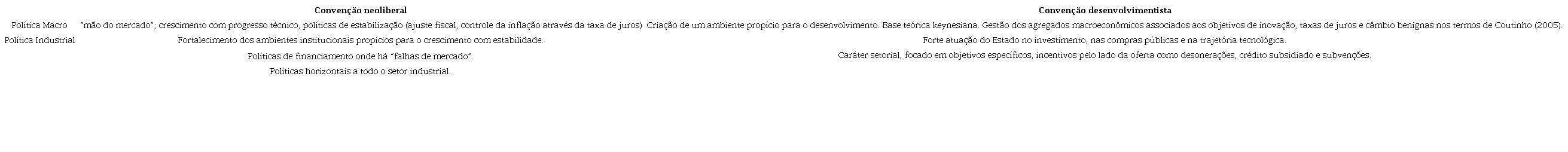 Para Erber (2011), a falta de confiança no período de transição de governo no início dos anos 2000 fez surgir duas convenções do desenvolvimento: uma mais conservadora com foco na estabilidade econômica, mais preocupada com a inflação (denominada pelo autor de institucionalista restrita); e outra chamada de neodesenvolvimentista, apoiada no investimento público e privado e no consumo das famílias. Porém, como os resultados da economia brasileira foram bons devido ao cenário econômico internacional, houve a coexistência de duas convenções do desenvolvimento sem que uma tenha sido mais hegemônica do que outra, que, partindo do Quadro 1 e do próprio nome, foram classificadas de neoliberal e desenvolvimentista, respectivamente.