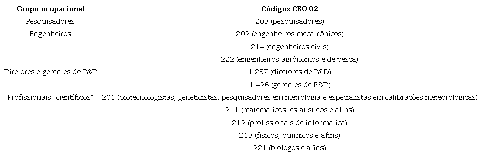 É definido pela literatura que a contratação desse grupo de empregados representa relevante parcela dos gastos em inovação das empresas. Assim foi obtido da RAIS identificada o quantitativo de alguns grupos ocupacionais empregados em atividades de C&T, sendo eles pesquisadores, engenheiros, diretores e gerentes de P&D, e profissionais “científicos” (GUSSO, 2006). Para a identificação desses grupos ocupacionais será utilizada a categoria da CBO, conforme o Quadro 2 retirado de Araújo, Cavalcante e Alvez (2009) e Marques, Sbragia e Faria (2017).
