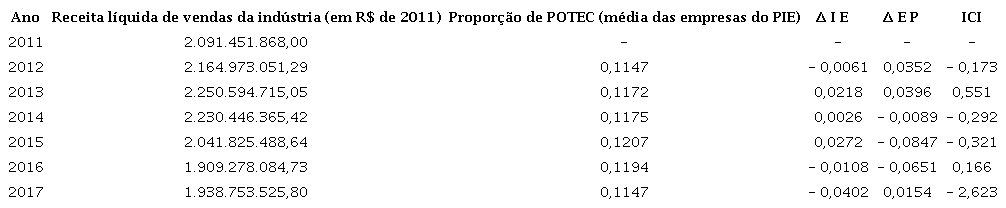 Em 2013, o ICI positivo de 0,551 indica uma significativa melhoria nas inovações tecnológicas em relação ao crescimento econômico. Este aumento pode ser atribuído a um ambiente econômico mais estável ou a políticas públicas que incentivaram a inovação no setor industrial. Porém, mesmo com o esforço de inovação das empresas, esse resultado não corrobora com um cenário de mudança de convenção, conforme sistema de regras do Quadro 3. Ou seja, o esforço de política industrial do PIE pode ter gerado algum incentivo nas empresas em aumentar a proporção de POTEC, mas isso não foi suficiente. Suzigan, Garcia e Feitosa (2020), denominaram esse efeito de “armadilha da inovação média”. Esse argumento é confirmado pelos resultados posteriores do indicador. Os valores negativos do ICI em 2014 (-0,292) e 2015 (-0,321) refletem uma desaceleração nos esforço, mesmo com flutuações na receita líquida. A crise econômica que se aprofundou em 2015 pode ter levado as empresas a cortar investimentos em inovação, priorizando a manutenção das operações básicas, conforme argumentado por Bastos (2017) e Rossi e Biancarelli (2015).