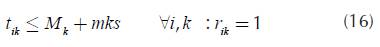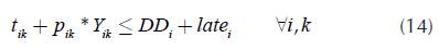 Related to time, Equation (14) computes violation on due dates, equations (15) and (16) ensure that the schedule of a given unit k begins at its own horizon time, and equation (17) ensures the time ordering between pseudo-products. Finally, Equations (18) to (20) give the variables' domain.
