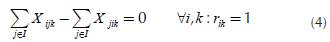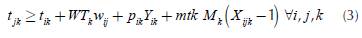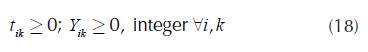 Equations (3) to (8) are related to sequencing. Equation (3) prevents overlapping and identifies the sequence. Balance equations are equations (4). Equations (5) and (6) compute the lot size Yik. Equations (9) and (10) restrict the initial and final nodes of each unit's sequence.