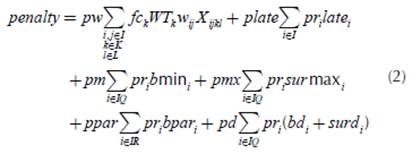 The objective function in Equation (1) is a profit maximization penalized by the violation of some of the operating restrictions. The first term on the right-hand side calculates the income generated by the total quantity produced minus the surplus with respect to the demand. The second term calculates the cost of production, including the costs of preparation, and finally, the third term is given by Equation (2). This equation penalizes (a) the inclusion of washing procedures, (b) late production, (c) production outside inventory limits, (d) partial deliveries not satisfied, and (e) differences from reorder points.