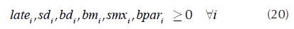 Equations (9) to (13) deal with the demand. Equation (9) computes the amount of production scheduled and the differences from the demand to the reorder point. Equation (10) computes deviations from partial deliveries, and Equations (11) and (12) deviations from minimum and maximum inventory levels. Equation (13) limits the maintenance batch size to 1.