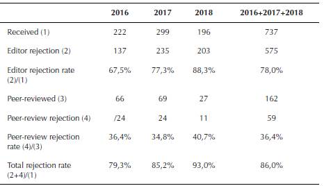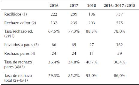 En primer lugar, observemos cuál ha sido el volumen de manuscritos recibidos. La Tabla 1 muestra los manuscritos recibidos y las tasas de rechazo entre 2016 y 2018. Los datos están resumidos hasta el 30 de noviembre de 2018.