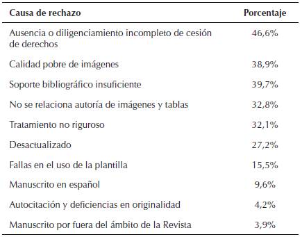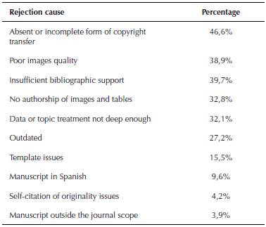 El Equipo Editorial ha revisado las causas de rechazo de los manuscritos relacionados en la Tabla 1. Esta revisión nos permitió relacionar los aspectos más destacados en la Tabla 2. Las causas de rechazo en la revisión de pares son diversas y están vinculadas al contenido de cada artículo, por lo que la Tabla 2 muestra sólo las causas de rechazo de la revisión del editor. Los manuscritos son rechazados en la mayoría de los casos debido a diversas combinaciones de las causas.
