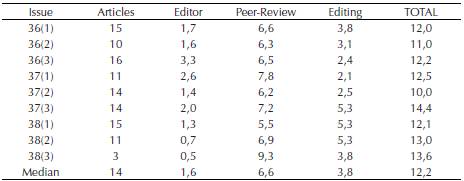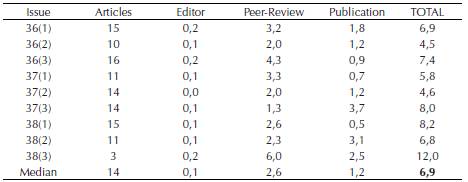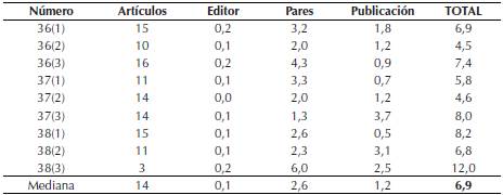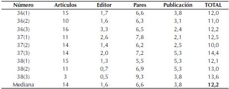 A continuación, mostraremos los tiempos de publicación recientes de la Revista Ingeniería e Investigación. Se relacionan los datos de los últimos tres años. La Tabla 3 muestra cinco aspectos relacionados con el tiempo de publicación; la cantidad de artículos publicados, los tiempos de revisión del editor, los tiempos de evaluación de pares, los tiempos de edición (corrección de estilo, diagramación, confirmación por parte de autores y publicación en OJS) y el tiempo total de publicación. En la Tabla 3, puede observarse que la labor más sensible es la revisión de pares, cuya mediana es 6,6 meses.