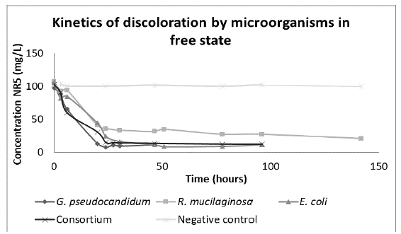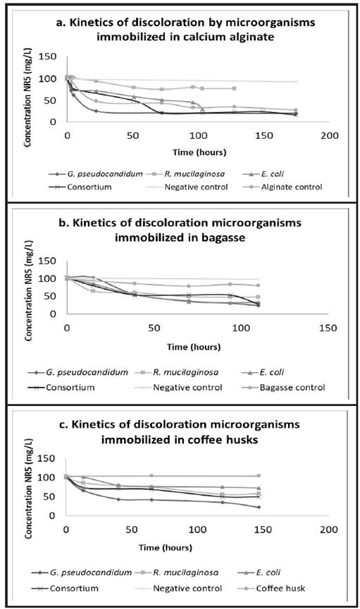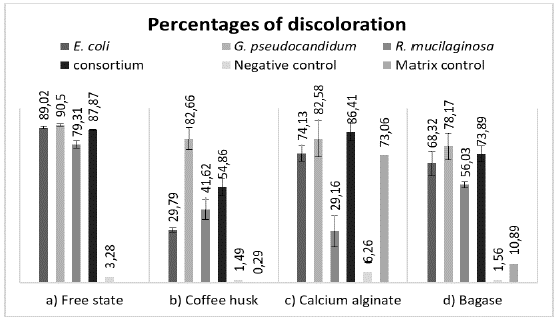 The present study showed that the consortium and the constituent microorganisms Rhodotorula mucilaginosa, Galactomyces pseudocandidum and Escherichia coli in free culture have the capacity to decolorize the NR5, therefore, they are presented as potential for its possible application. In addition, it was demonstrated that the immobilized microorganisms in the different matrices did not lose their viability and their fading ability; however, in comparison with the free microorganisms, a lower percentage of discoloration of NR5 was obtained, both individually and in a consortium. However, the immobilization is presented as a viable alternative because of the many of its advantages. The present investigation allowed to determine that the use of agroindustrial residues as immobilization matrices have proven to be viable for use in dye treatment processes using microorganisms, leaving the door open for future studies of application of these matrices in the field.