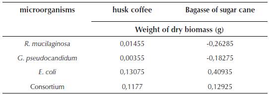 When comparing the percentages of retention of the microorganisms in the coffee husk, it was obtained that E. coli was immobilized 97,3%, 88,9% and 11% more than G. pseudocandidum, R. mucilaginosa and the consortium, respectively. This variability can be attributed to the differences in the time of duplication of the evaluated microorganisms, since the yeasts have had longer time to the one of the bacteria, and as it has been demonstrated in other studies, the colonization of the matrices depends on the rate of growth of the microorganisms (Orzua et al., 2009). With reference to the immobilization in the cane bagasse, G. pseudocandidum and R. mucilaginosa present negative values of dry weight (Table 1), which can be attributed to the degradation of the matrix by the yeasts that use it as a source of carbon (Garzón, 2009). On the other hand, is important to consider the loss of biomass due to the agitation process necessary to avoid sedimentation of the microorganisms and favor their contact with the matrix, since the passive immobilization process does not ensure a complete fixation of the cells (Garzón, 2009).