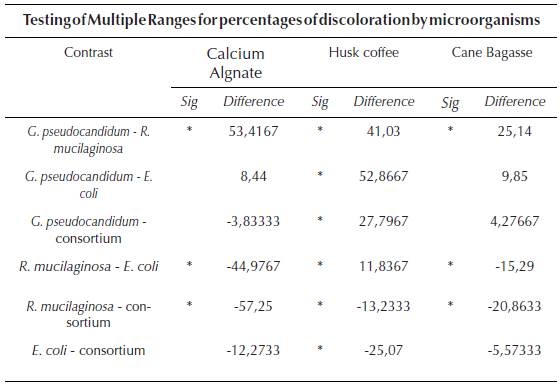 The immobilization matrices and the discoloration capacity of the individual and consortium microorganisms were compared by ANOVA using the statistical program STATGRAPHICS® Centurion XVI with a confidence level of 95% (P <0,05). In addition, multiple range tests were performed to observe the significance between the matrices. Finally, all treatments were performed in triplicate to obtain statistical validity of the data obtained experimentally.