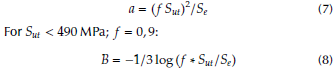 The temperature factor for human life (kd) = 1. For 99 % reliability, the reliability factor corresponds to 8 % standard deviation of the endurance limit (ke) = 0, 82. The miscellaneous-effects factor (kf) = 1. Then, the modified endurance limit (Se) can be obtained by using equation (2). The fatigue life, i.e. the number of cycles to the failure (N) at a given fatigue stress (σ), is found as: