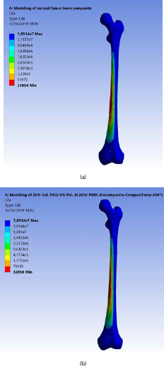 The ANOVA analyses of the values of fatigue life for the fabricated biomaterials are listed in Table 8. The model F-value of 227,69 implies that the model is significant. The 3D graphs show that the fatigue life values increased with the biomaterial density and compact temperature, as shown in Figure 10. Figure 11 shows the maximum values of fatigue lives of the modeled natural femur bone and for the best result of the fabricated biocomposite (20% vol. TiO2/5% vol. Al2O3/PEEK) at compact temperature of400 °C, reaching 50,51 and 70,93 x 106 cycles, respectively.