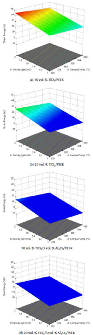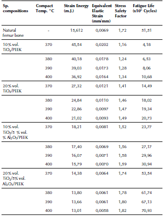 The lower maximum strain energy values obtained with the modeled the natural femur bone and the best fabricated biocomposite (20% vol. TiO2/5 % vol. Al2O3/PEEK) at the highest compact temperature of 400 °C are equal to 15,61 and 13,01 m.J., respectively. The strain energy was reduced in 20%, when compared with natural femur bone material.