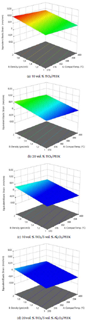 ANOVA analysis of the equivalent elastic strain and the stress safety factor values for all the examined biomaterials are listed in Tables 6 and 7. The F-values of 185,14 and 252,14 imply that the models are significant. The 3D graphs show that the equivalent elastic values increased with the decrease in the biomaterial density and in compact temperature, as shown in Figure 6. Figure 7 shows the 3D graphs of the stress safety factor values, which decreased with the increase in the biomaterial density and in compact temperature.
