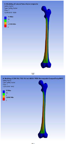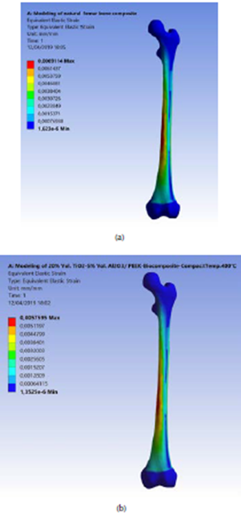 The maximum equivalent elastic strain and the stress safety factor values for the best fabricated biocomposite (20 % vol. TiO2/5% vol. Al2O3/PEEK) at compact temperature of 400 ° C reached 0,0051 mm/mm and 1,82, respectively. These equivalent elastic strains and these values are better than those obtained for the modeled natural femur bone composite by 26,09% and 5,81 %, respectively.