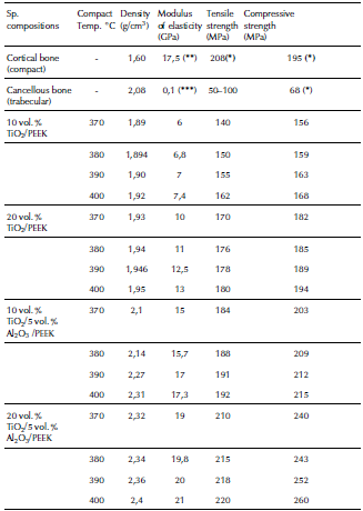 The four mixed biocomposites were prepared for implants with different compositions with composites of 10 vol. % of TiO2 and 90% PEEK, 20 vol.% of TO and 80% PEEK, 10 vol.% of TiO2 with 5 vol.% of Al2O3 and 85 % PEEK, and 20 vol. % TiO2 with 5 vol. % of Al2O3 and 75 % PEEK. The mechanical and physical properties of the PEEK, TiO2 and Al2O3 are presented in Table 1.