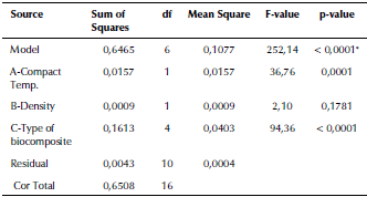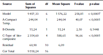 The external mechanical work causes the elastic deformation of the femur bone structure in daily human activities, as movement is transformed into internal strain energy. The bone failure occurs when the maximum shear strain energy component is equal to the corresponding value at the yield point in the tensile test. The ANOVA analysis of the internal strain energy of the fabricated biocomposite materials are given in Table 5. The F-value of 195,28 implies that the model is significant. The 3D graphs show that the strain energy values increased with the biomaterial density and vice versa, with the tensile strength, the elastic strain and compact temperature, as shown in Figure 4.