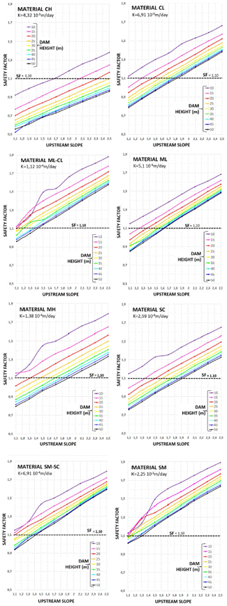 Table 6 shows that CH soils are the least recommended for upstream slopes, because they have lower maximum heights for each analyzed slope -as explained below in the comparison of results- while the others are quite adequate.