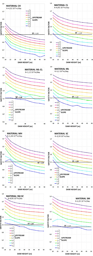 The work consisted in simulating the transient flow induced by the lowering of the reservoir and performing stability analysis of the upstream slope at several stages of the transient analysis for different heights of a dam (from 10 m to 50 m), different inclinations of the upstream slope (1V: 1.1 H to 1V:2.5 H) as well as different materials in the dam embankment (SM, SM-SC, SC, ML, ML-CL, CL, MH and CH) according to the Unified Soil Classification System (USCS).