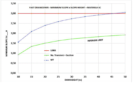 The results demonstrated the advantages of considering the actual flow and suction conditions of the upstream slope for a rapid drawdown context. The equations correlating the minimum slope with the height of the dam represent the lower limit, to be considered once the velocity adopted in the analyses corresponds to the lower velocity defined by the USBR. It can be a valuable aid in the definition of dam geometry as much as in the construction process or schedule, and the selection of borrowing areas. As an example of the proposal, graph 9 shows the curves for the SC material, highlighting the application range.
