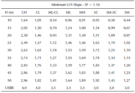 Pre-dimensioning of slopes depends largely on the type of dam (homogeneous or heterogeneous) and the nature of the materials used in its construction. Table 1 presents the recommendations of the U.S. Bureau of Reclamation (2002) for slopes of homogeneous dams, considering or not the possibility of rapid drawdown, for different types of soils.