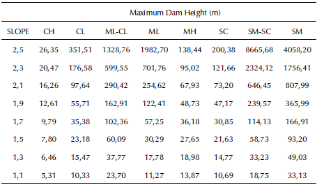 Using such equations and considering a safety factor of 1,1 a minimum slope and maximum height of the dam were determined for all types of material studied, which are presented in Tables 5 and 6, respectively.