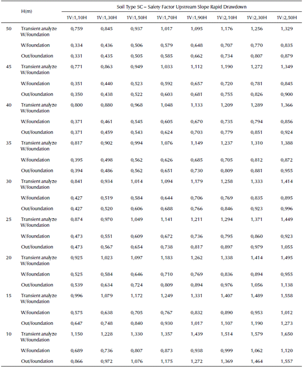 It can be seen that CH-type soils, among the evaluated ones, are the least adequate for upstream slopes of dams where rapid drawdown is expected because safety factors greater than the unit are obtained solely for dam heights equal to or less than 20 m and 25 m, respectively with and without the foundation layer. While safety factors considering transient flow and suction are greater than 1,0 for slopes as steep as 1V: 1,7 H., using this type of soil would result in a greater use of soil volumes, which in turn would mean higher costs and execution times.