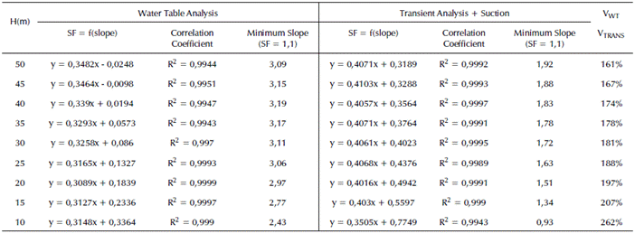 Table 8 shows the adjusted equations, the minimum slopes for each height and type of analyses, as well as the percentual relationship between the volume with the water table alternative and the volume considering transient analysis and suction.