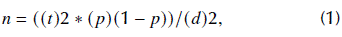 The sample size was calculated by applying the Bartlett equation (equation 1) (Bartlett, Kotrlik and Higgins, 2001), where n is the size of the sample and t is the value of the normal distribution for a certain level of confidence, which in this case was taken as being 85% (t = 1,44). p is the proportion that is expected to be found and, when this is unknown, the recommendation is to take a value p = 0,5; that is to say, 50%. Lastly, d is the margin of error the researcher is willing to accept, which in this case will be 10% (0,1). On substituting the values in the equation (1), a minimum sample size of 52 is obtained.