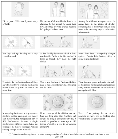 To demonstrate the advantages of the adaptable product, original material was developed consisting in the use of storytelling to narrate a solution that allows for the adaptation of a stroller purchased in the past. This material seeks to describe in detail how the product adapts to the changing needs that arise as time goes by. In this way, users of a non-adaptable version of the product will have audiovisual information about the advantages of the adaptable design. In the video (https://vimeo.com/129596346), they can also see the environmental benefits the adaptable design has to offer, in terms of total use time of the product and the kilograms of material that could be saved per year. Figure 1 shows the script of the video developed for the study.