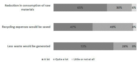 With regard to their answers to the questions about how they perceive adaptable products could help the environment, Figure 2 shows that most of the participants think they would make an important contribution to generating less waste (72%) and to consuming fewer raw materials (65%). Half of them think that it would make quite an important contribution to reducing recycling costs (49%). Therefore, participants clearly perceive the advantages for the environment.