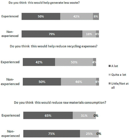 Another analysis was performed to determine whether the experience of going from carrying one child to having to carry two has an influence on the perception of the environmental advantages. Figure 3 shows the results obtained for the three additional closed-ended questions about how users perceived the environmental advantages of a convertible stroller. The results showed that the subjects of the experiment thought this helps to reduce waste and reduces recycling expenses "a lot" or "quite a lot", and that it would greatly reduce the consumption of raw materials. Data showed that non-experienced people do perceive the environmental advantages more strongly, but the Chi2 tests (α = 0,005) yielded no differences according to the type of user, nor did the Cramer's V test.