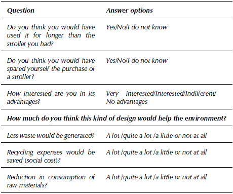 This objective is divided into a set of particular objectives: first, to analyze the effectiveness of the communication of an adaptable baby stroller. Secondly, to state whether users value both the advantages derived from the adaptability of design and its potential environmental advantages. Then, to analyze whether a higher valuation of the advantages for the user also implies a higher valuation of the environmental advantages, that is, if they are related. Another aim is to determine whether the valuation of the advantages of adaptable designs depends on the age or previous experience of the need that is covered by the product's capacity to adapt one or some of its functions over time.