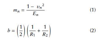 When considering two spheres, Norton (2013) and Juvinall and Matshek (2008) state that the stress between them is dependent on the material and geometrical constants of each sphere. The first is shown in Equation (1), where n is the index that defines each element; and the second is referred to in Equation (2) and involves the curvature of both spheres (R1 e R2)