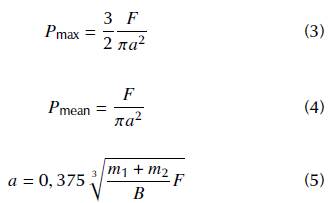 According to Norton (2013) and Juvinall and Matshek (2008), the maximum pressure is seen at the center of the contact region, and Pmean is the mean pressure obtained through the division between the applied load F and the contact area of radius , which is obtained through Equation (5).