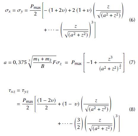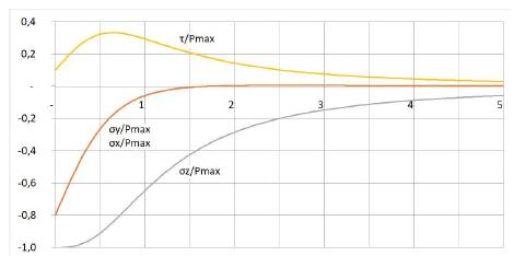 Figure 5 shows that σx and σy have the same behavior. The maximum stresses are located at z = 0 and have values around 0,8 Pmax. These stresses fall quickly as the depth increases. When the depth reaches approximately 1,5x the value of a, σx and σy become null.