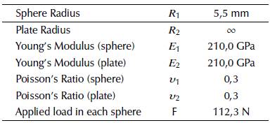Applying the parameters previously mentioned in the Equations (3-8), the results for the five maximum stresses were obtained, as indicated in Table 3. The radius of the contact circumference is 0,159 mm, and the contact area between the bodies is 0,0793 mm2.