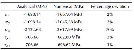 With the values mentioned in section 3, it was possible to begin with the analytical and numerical approaches. The results are displayed in Table 3, where a percentage deviation between the results is also presented, in order to show the percentage difference from the stresses obtained by both approaches. All results in Table 3 are located at z = 0 and correspond to the maximum values found in the model.