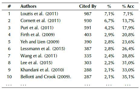 The same procedure was applied for Scopus (38 papers were selected) and Science Direct (112 papers). Adding WoS 27 papers, Scopus' 38 and Science Direct 112, the 177 selected documents were put together, and the duplicated ones were excluded in order to present a clean-cut from all selected papers. After that, the next step for the proposed review was to apply several exclusion criteria. First, the papers which were not found were excluded; secondly, papers from conferences; after that, the ones without credit risk applications; then, papers before 2009 (they were excluded from the content analysis); and finally, the ones that had theoretical explanations (i.e., papers that did not apply data mining techniques, surveys, state of the art reviews, and theoretical frameworks).