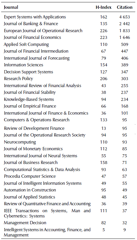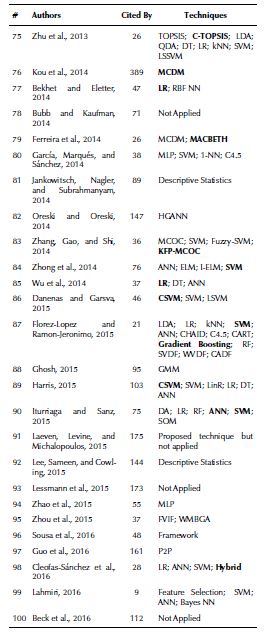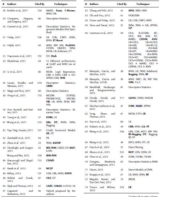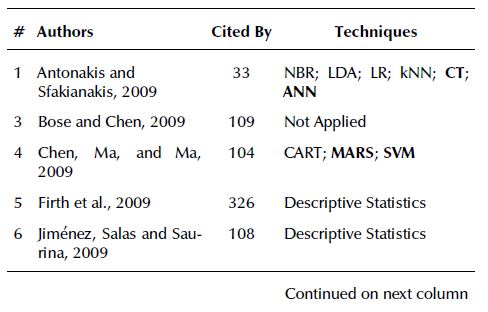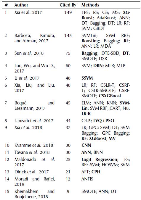 From Table 3, we were able to assume that journals with a higher h-index were not always cited more than the others. The seven first journals presented in this table represent 80% of the overall citation, being Expert Systems with Applications, Journal of Banking & Finance, European Journal of Operational Research, Journal of Financial Economics, Applied Soft Computing, Journal of Financial Intermediation, and the International Journal of Forecasting. After analyzing the information surrounding each paper, their content was reviewed, and the Table 4 below was built in order to summarize their information in chronological order. The best performance technique (where possible) is indicated in boldface.