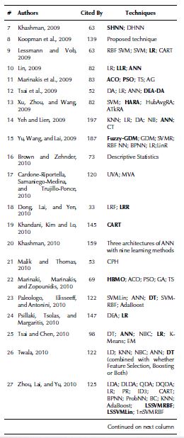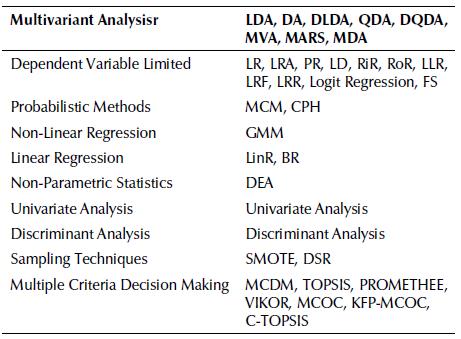 From among these techniques, CVSM was found to have a better performance than the rest of the techniques. There were works where four different types of hybrid models were compared by 'Classification + Classification', 'Classification + Clustering', 'Clustering + Classification', and 'Clustering + Clustering' techniques, respectively, applied on a Taiwan dataset where it was found that a Classification + Classification (LR + ANN) had a better performance than the other hybrids (Tsai and Chen, 2010).