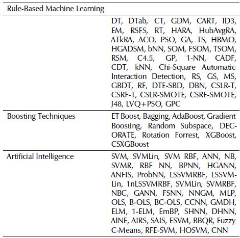 Considering Machine Learning methods apart from AI-related ones, e.g. rule-based algorithms, the most used was DT with 16 applications, and kNN followed, appearing in 11 documents. And, finally, concerning boosting techniques, both Bagging and AdaBoost were the most common among the studied papers.