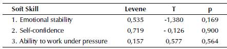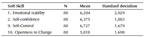 Regarding self-control, flexibility, emotional stability, and self-confidence, statistical data indicate scores above the average. Thus, they were deemed to be far from one of the main objectives of the project: to design a university program that improves soft skills. Furthermore, the evaluated sample is considered significant to draw conclusions from this descriptive analysis.