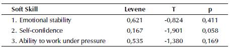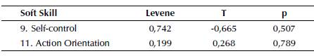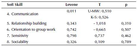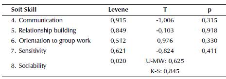 In the intrapersonal area, there are no significant differences in gender (Table 4) or age (Table 5). The 'p' associated with the statistical T is greater than the prefixed level of significance α = 0,05. Results demonstrate that, in personal engineering-related skills, both men and women are equally prepared. This result suggests that the small number of women in technical degrees is not related to gender. The next analysis focused on the interpersonal area, regarding both gender (Table 6) and age (Table 7).