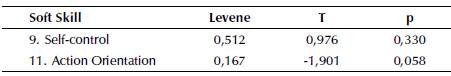 In both cases, gender and age, there are no significant differences between the groups in the interpersonal area, since the 'p' associated with the statistical T is greater than the prefixed level of significance α= 0,05. Although an increase in the mean is observed as the age increases. Consequently, the skills necessary for team interactions in current engineering do not differ either. Finally, Tables 8 and 9 present the results of the activity development area.