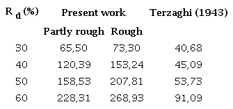The results obtained in the current study related to the bearing capacity of the unskirted square footings (partly rough and completely rough) and were compared with the classical bearing capacity formula reported by Terzaghi (1943). To calculate the bearing capacity of the footing, the friction angle obtained from the triaxial test for different relative densities was used. This comparison is shown in Table 2.