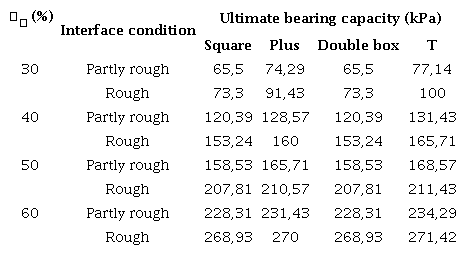 A careful study of this table indicates that, for a given relative density, irrespective of the interface condition of the footing, T-shaped footings is provide the highest bearing capacity, followed by Plus, double box, and square shapes. The difference in the bearing capacity of the footing is quite substantial for the lower relative density, i.e., at Rd = 30%. It should be noted that, without any skirts, double box and square-shaped footings are both the same, hence the identical value of the bearing capacity.